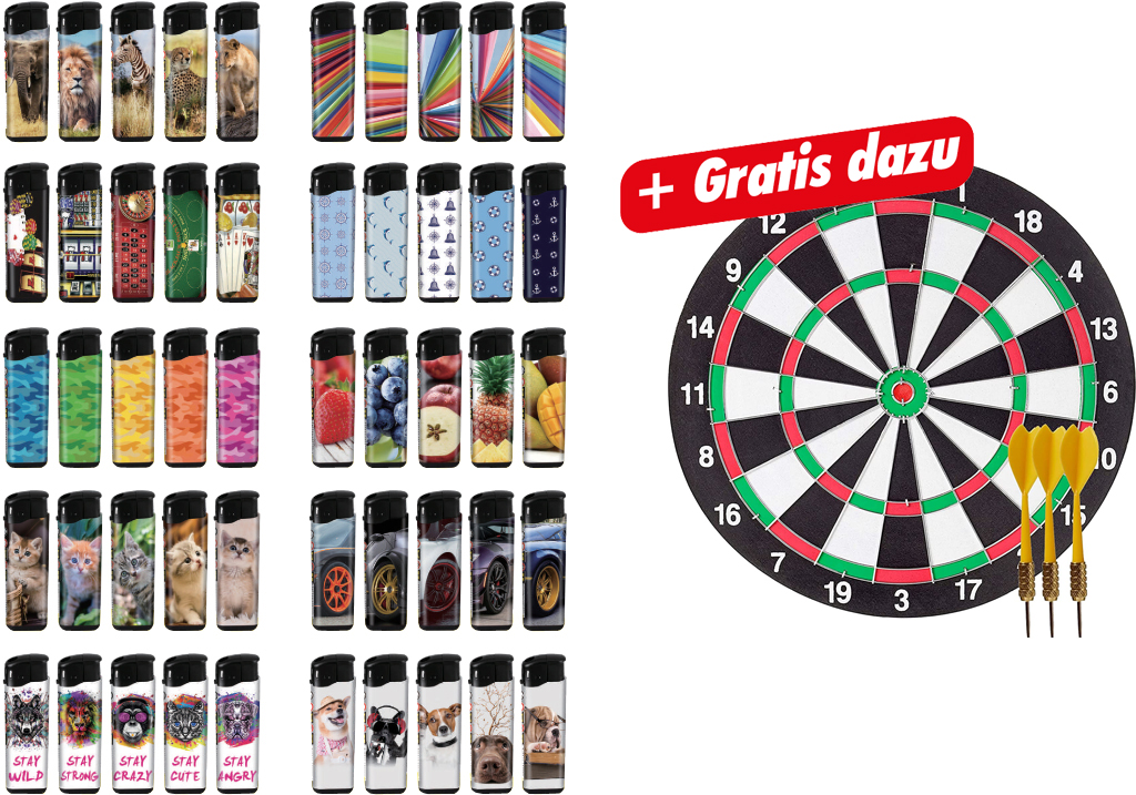 Elektronik Fzg. - 500 Stk. MIX Motive Sortiment, nachfüllbar, 10 Modelle je 50 Stk. im Dsp. + GRATIS Dartset, Dartscheibe aus Kork ca. 43cm, inkl. 6 Pfeile (108851 & 100737)