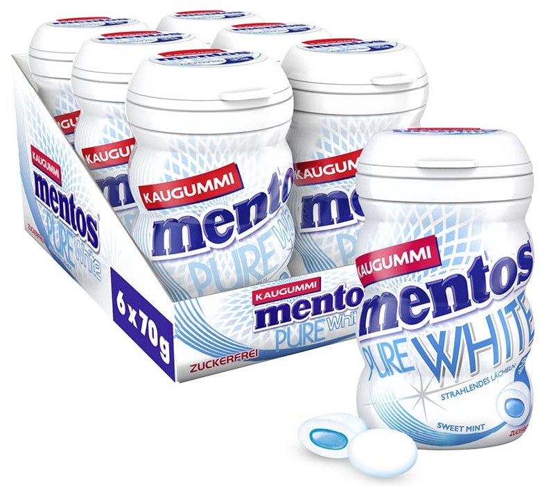 Mentos Gum Pure White zuckerfrei Kaugummi-Dragees mit Minz-Geschmack und flüssiger Füllung mit Weißtee-Extrakt 70g 35er Dose