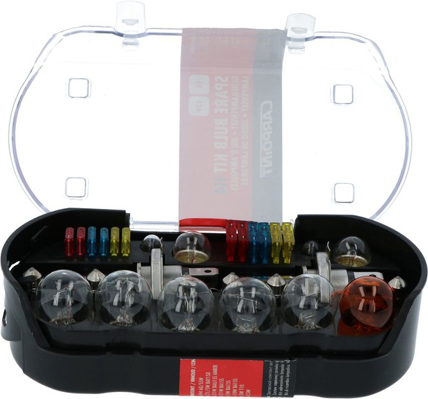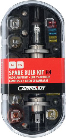 Carpoint Ersatzlampenkasten H4 30 tlg. Set mit 18 Lampen und 12 Sicherungen, mit E-Prüfzeichen (2x H4 Scheinwerferbirne, 3x P21/5W, 1x PY21W Blinkerbrine, 2x P21W, 2x W5W, 1x R10W, 1x R5W, 3x C5W, 3x T10,5x43; jeweils 2x 10-, 15- & 20-Ampere Sicherungen & jeweils 2x 10-, 15- & 20-Ampere Minisicherungen)