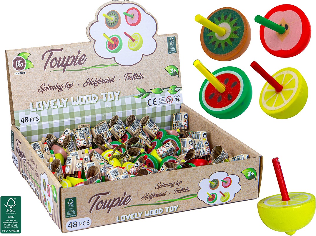 Holzkreisel Früchte ca. 5cm Feinmotorik Spielzeug 4/s im 48er T-Dsp.(Kiwi, Apfel