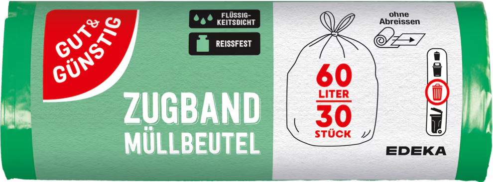 G&G Müllbeutel mit Zugband Grün, reißfest & flüssigkeitsdicht, 30 Stk. á 60L