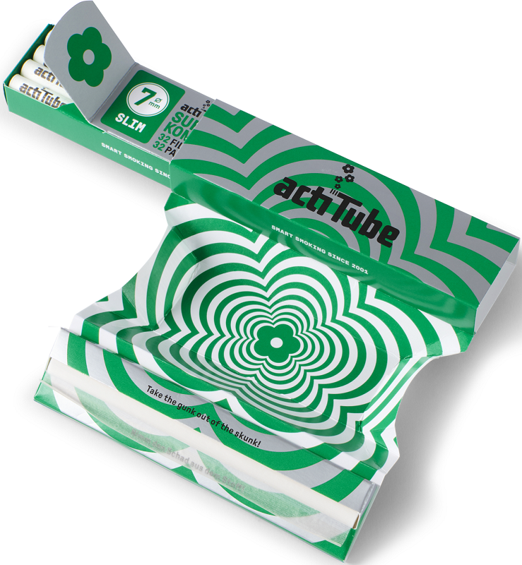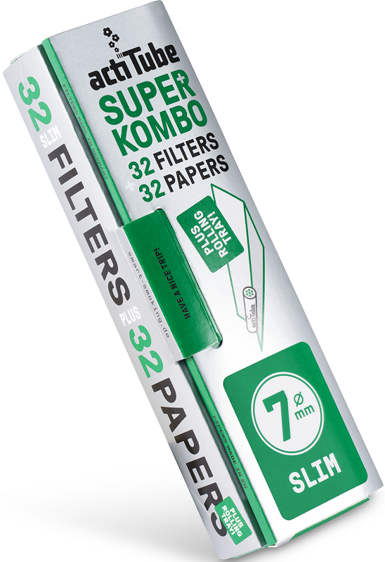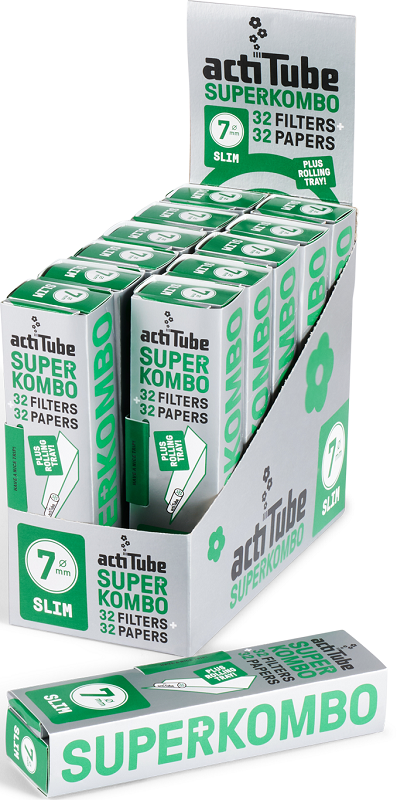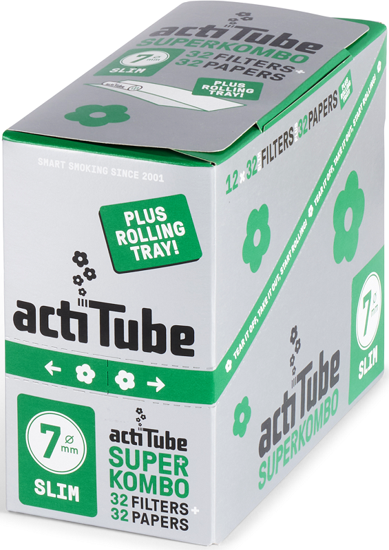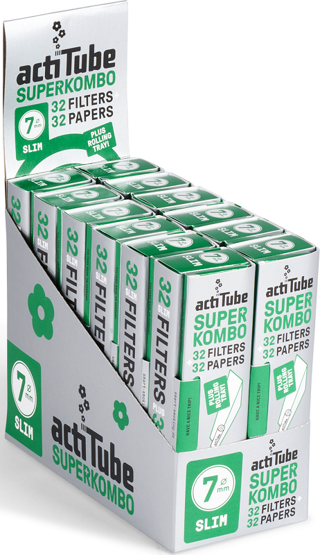 ACTITUBE Superkombo 7mm SLIM Filters + Papes mit Rolling Tray, je Heftchen 32 Filter & 32 Papes im 12er T-Dsp.