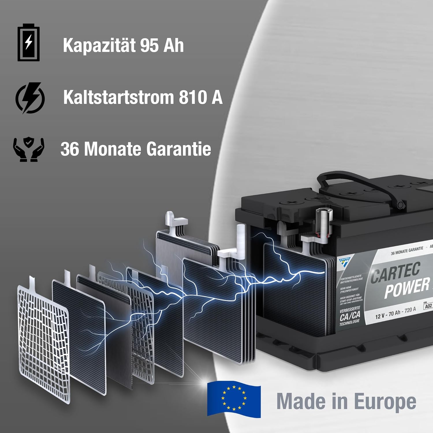 CARTEC POWER AGM Starterbatterie 95 AH / 810 A (KSN A04) - Wartungsfrei, geeignet für moderne Fahrzeuge mit Start-Stopp-Systemen (mit & ohne Rekuperation), sehr hohe Zyklenfestigkeit & verbesserte Ladeeffizienz, Auslaufsicher & bis zu 45° verbaubar, verbesserte Kaltstartfähigkeit, fortschrittlichste Betterietechnologie auf dem Markt (Kaltstartstrom 810A, verlängerte Lebensdauer + 36 Monate Garantie)